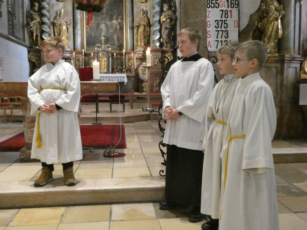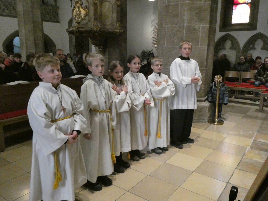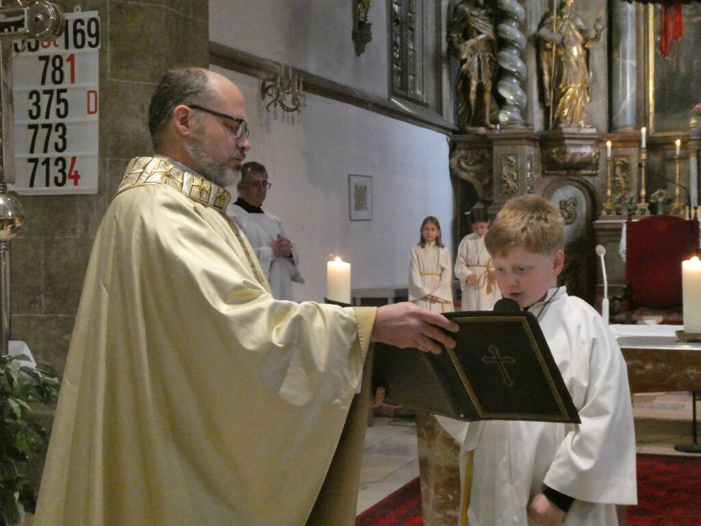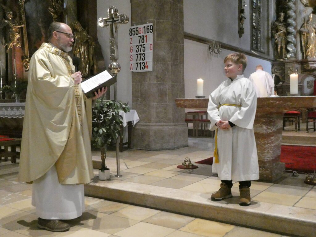Heute ist ein besonderer Sonntag. Eingeführt im Jahre 1925 anlässlich des 1600-Jahr-Jubiläums des Konzils von Nicäa 325 von Papst Pius XI., ist dieses Fest damit 100 Jahre alt und damit genau 1700 Jahre nach dem ersten Konzil. Eingebürgert hat sich damit auch an diesem letzten Sonntag im Kirchjahr die Aufnahme neuer Ministranten. So hat sich auch bei uns ein junger Mann bereiterklärt, Christus als seinem König zu folgen. Hier einige Fotos aus der Zeremonie. Der Jungministrant bekam auch ein Kreuz vom Diakon Slava umgehängt, dieses hatte vorher Pfarrer Tom gesegnet. Von Jakob Schick wurde zusätzlich zum Orgelspiel von Michi Polklop die Messe mit herrlichem Trompetenspiel untermalt.