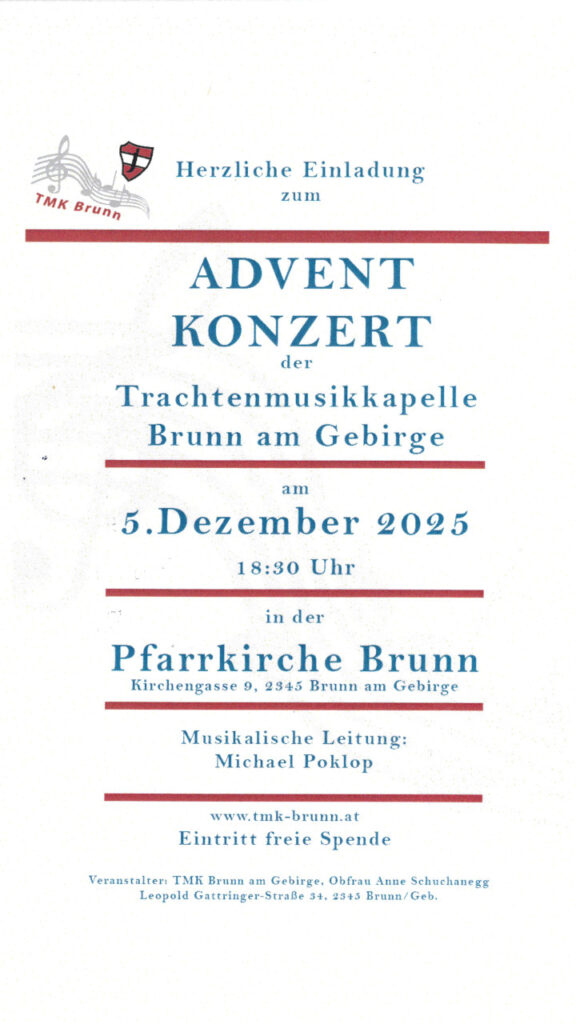 Konzert der Trachtenmusikkapelle Brunn am Gebirge – Freitag, 5. Dezember, 18:30 Uhr