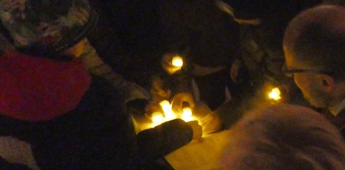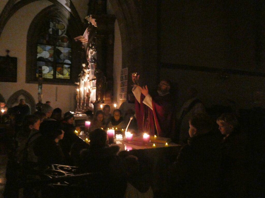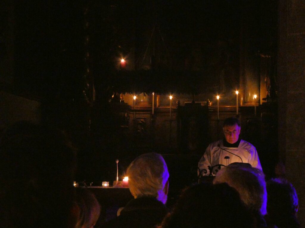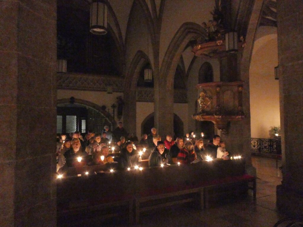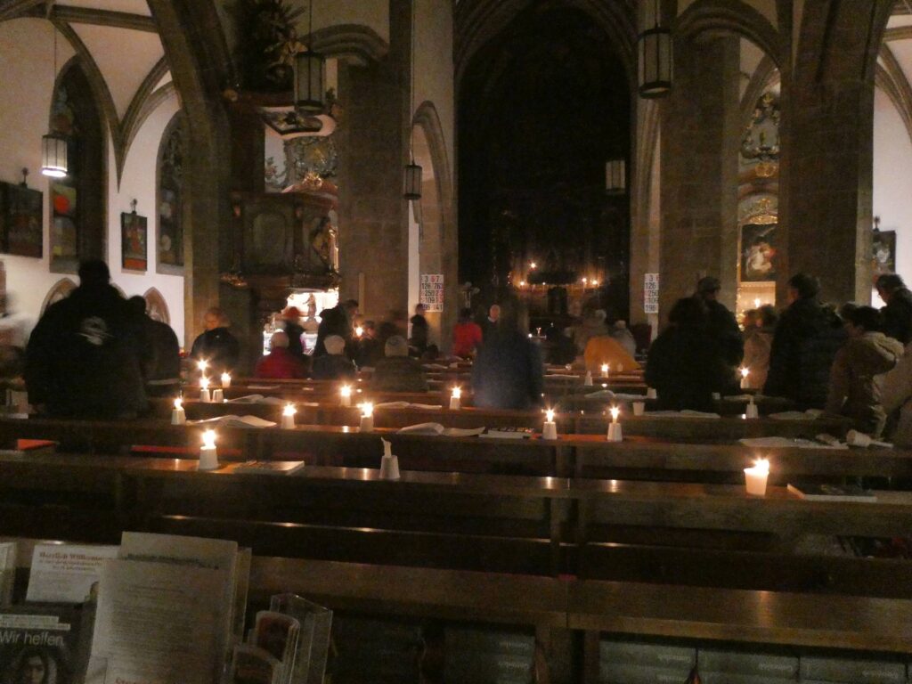 Welche Freude, die Bänke sind fast vollständig besetzt. Die Kirche ist finster bis aufs Kerzenlicht.