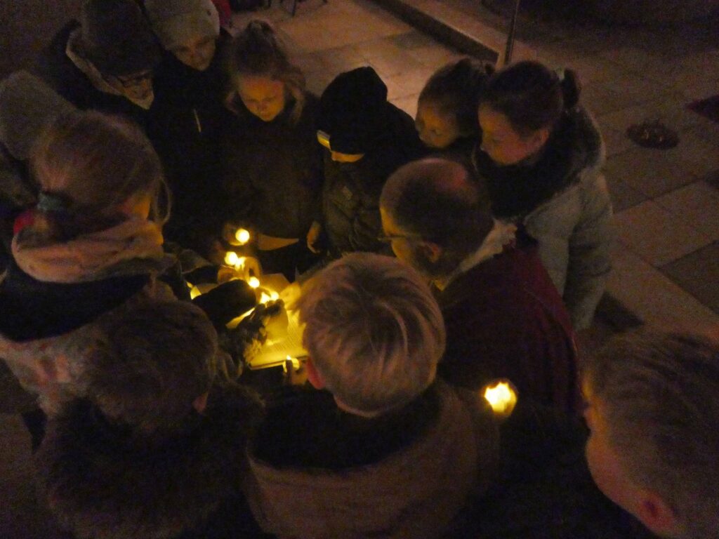 Pfarrer Tom zeigt den Kindern: es ist schwierig mit einem Licht zu lesen, wenn aber viele zusammenstehen und ihre (Batterie-) Lichter zusammenhalten, dann kann man eine ganze Seite beleuchten und lesen.