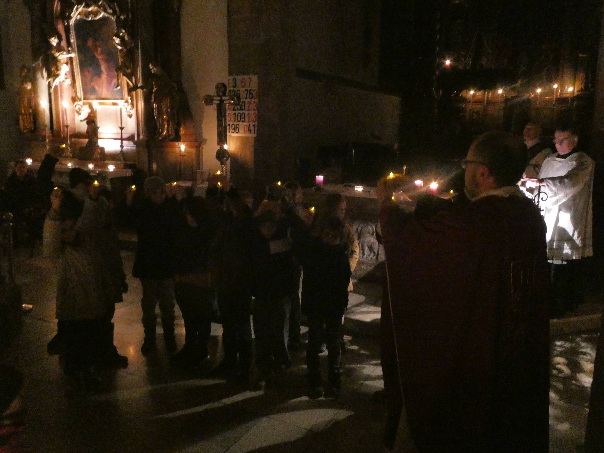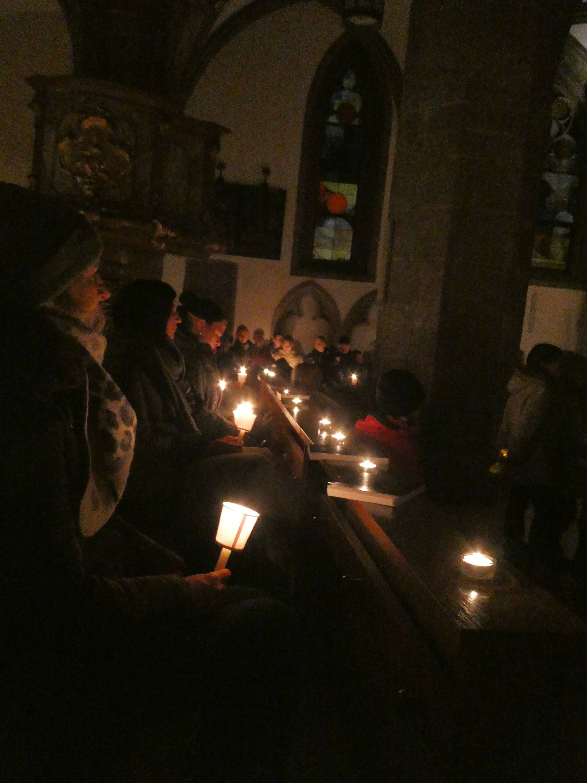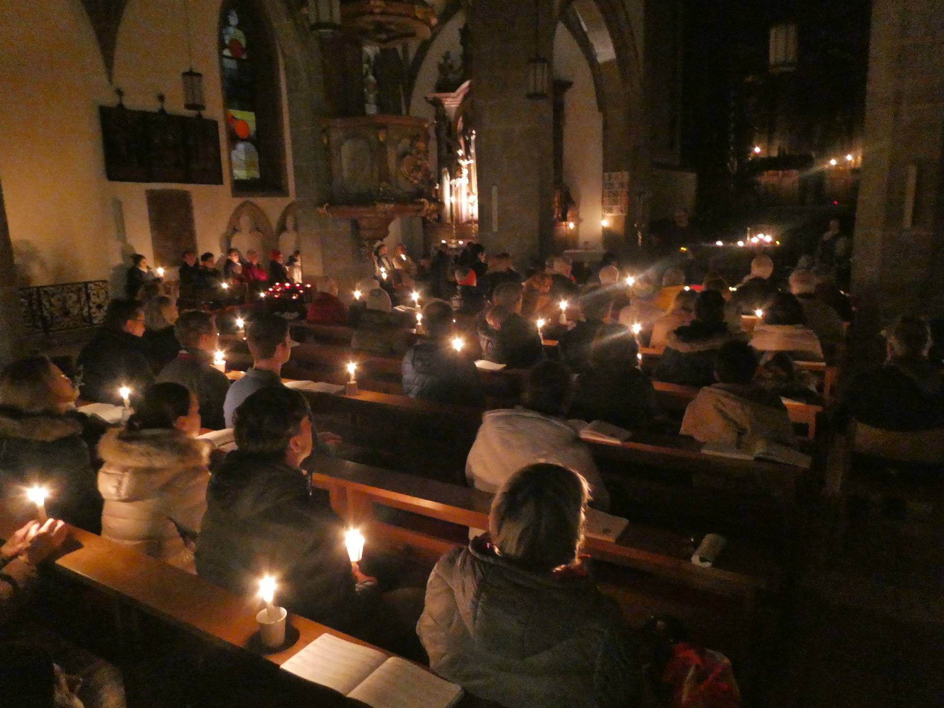 Welche Freude, die Bänke sind fast vollständig besetzt. Die Kirche ist finster bis aufs Kerzenlicht.