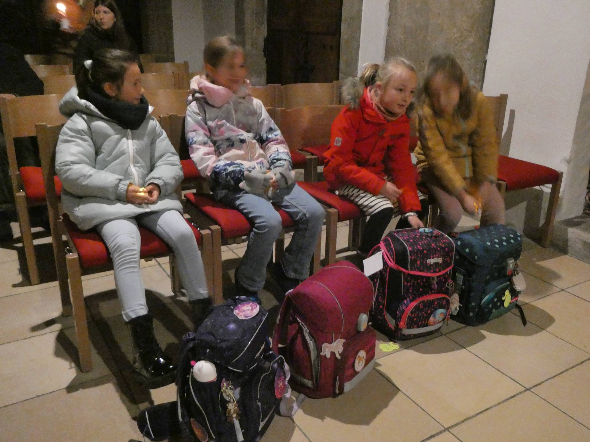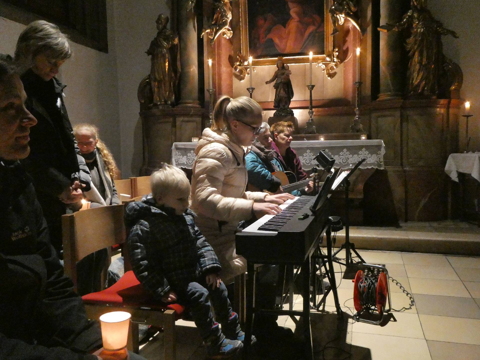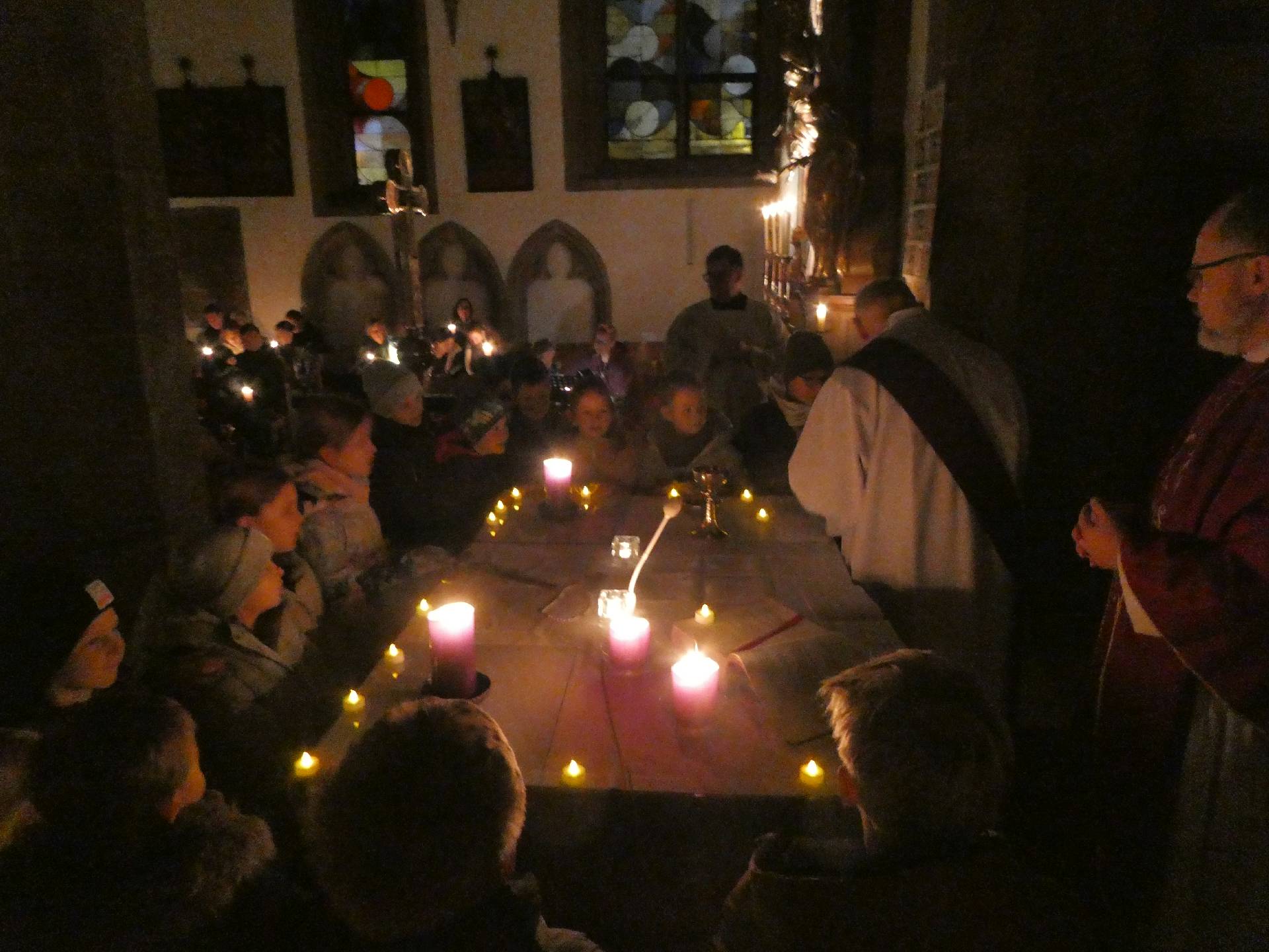 Welche Freude, die Bänke sind fast vollständig besetzt. Die Kirche ist finster bis aufs Kerzenlicht.