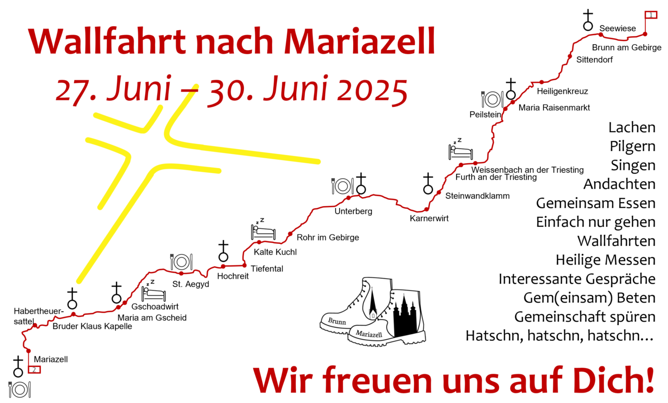 Liebe Wallfahrer, wir laden Euch wieder ganz herzlich zur Wallfahrt der Pfarre Brunn nach Mariazell von Freitag den 27. Juni bis Montag den 30. Juni 2025 ein. Die Anmeldung ist ab sofort über die Mailadresse …